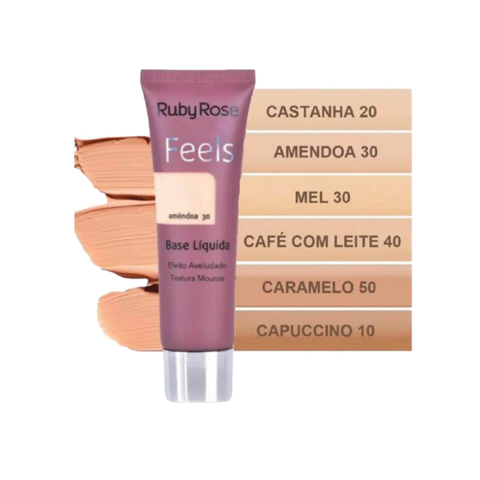A Base Líquida da linha Feels Ruby Rose proporciona cobertura média, capaz de construir camadas, ideal para quem quer corrigir imperfeições e uniformizar o tom da pele, sem deixar com aspecto pesado.