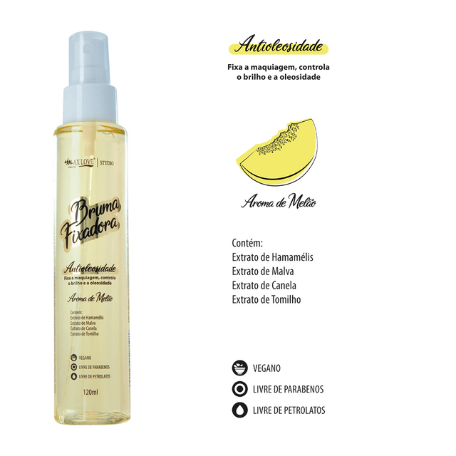 A Bruma Fixadora Antioleosidade Com Aroma de Melão Max Love auxilia na fixação da maquiagem na pele, prolongando sua duração. Fórmula enriquecida com Hamamélis, Malva, Canela e Tomilho, componentes que juntos, auxiliam no controle do brilho e oleosidade da pele. Com suave aroma de Melão. Fórmula vegana, livre de parabenos e livre de petrolatos.