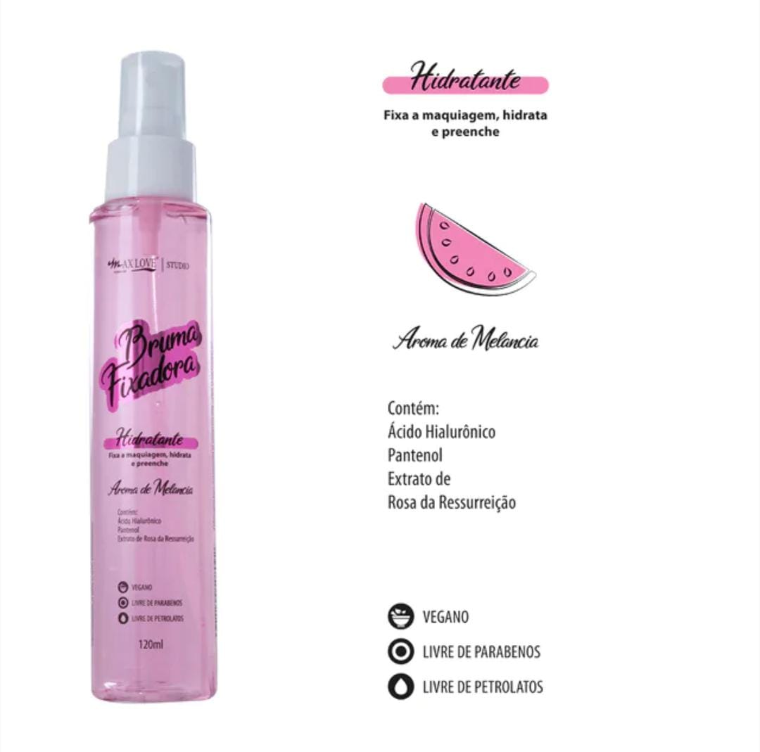 A Bruma Fixadora Hidratante Com Aroma de Melancia Max Love auxilia na fixação da maquiagem na pele, prolongando sua duração. Fórmula enriquecida com Ácido Hialurônico, Pantenol e Extrato de Rosa da Ressureição, componentes que juntos, auxiliam na hidratação e proteção da pele contra os danos causados pelo calor ou pelo frio. Com suave aroma de Melancia. Fórmula vegana, livre de parabenos e livre de petrolatos.