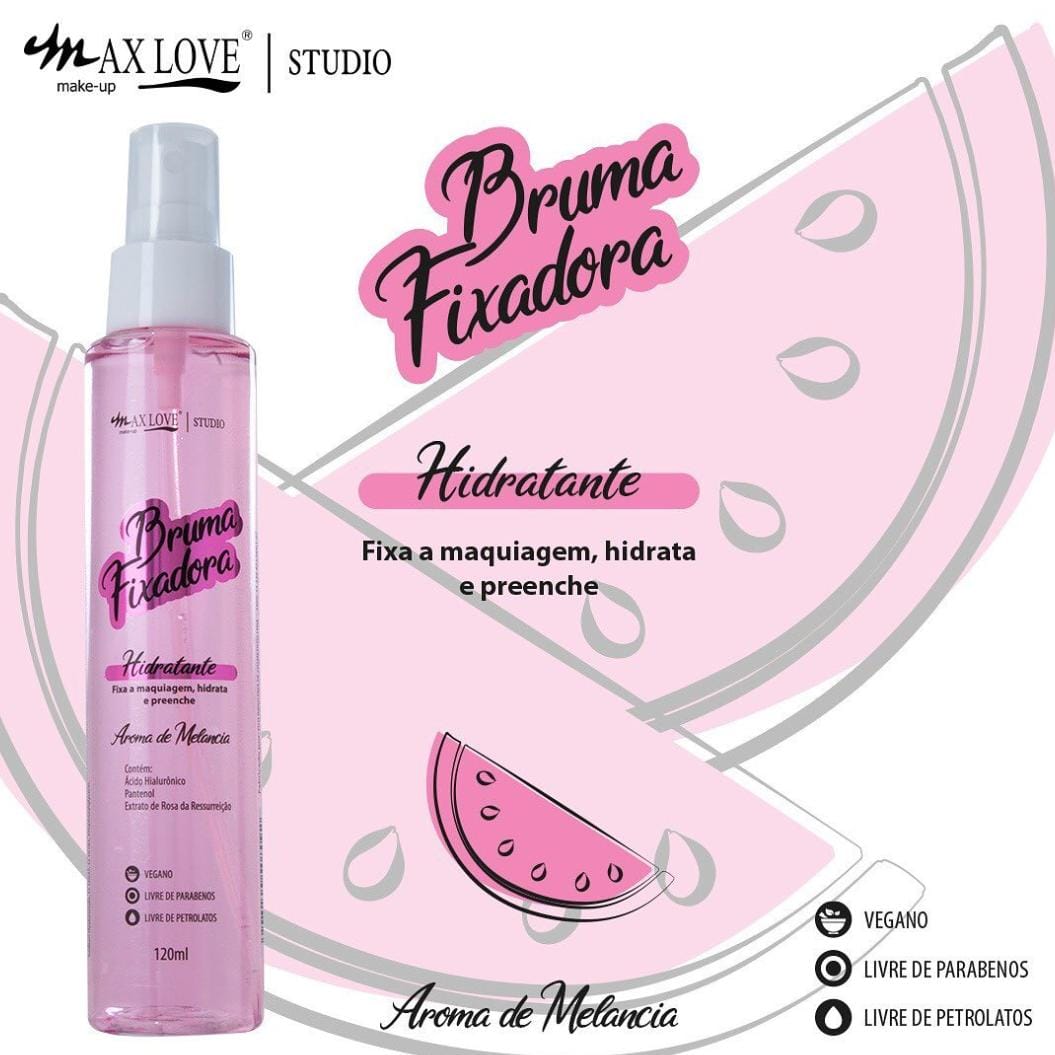 A Bruma Fixadora Matte Max Love, com secagem rápida e toque seco, auxilia na fixação da maquiagem na pele, prolongando sua duração.