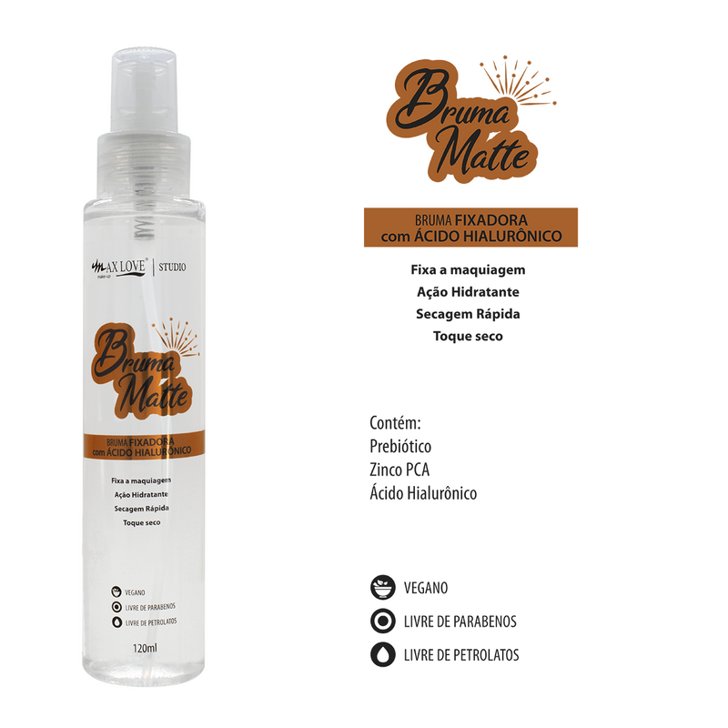 A Bruma Fixadora Matte Max Love, com secagem rápida e toque seco, auxilia na fixação da maquiagem na pele, prolongando sua duração. Fórmula enriquecida com Prebiótico, Zinco PCA e Ácido Hialurônico que proporciona ação hidratante. Produto vegano, livre de parabenos e livre de petrolatos.