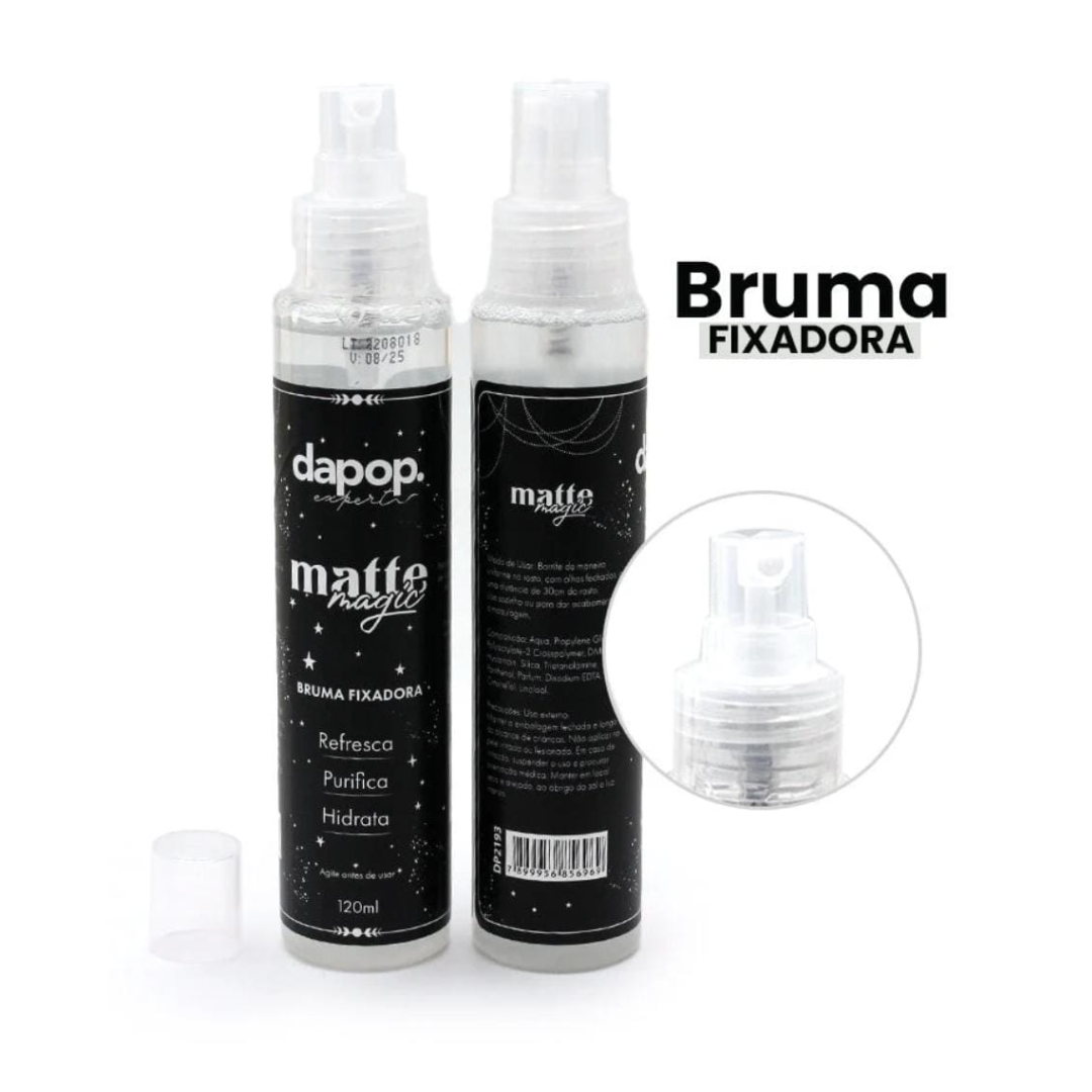 A Bruma Fixadora Matte Magic DaPop DP2193 é o segredo para uma pele impecável e sem oleosidade por muito mais tempo! Sua fórmula inovadora combina agentes que controlam instantaneamente o brilho e absorvem a oleosidade, proporcionando um acabamento fosco, fresco e confortável.