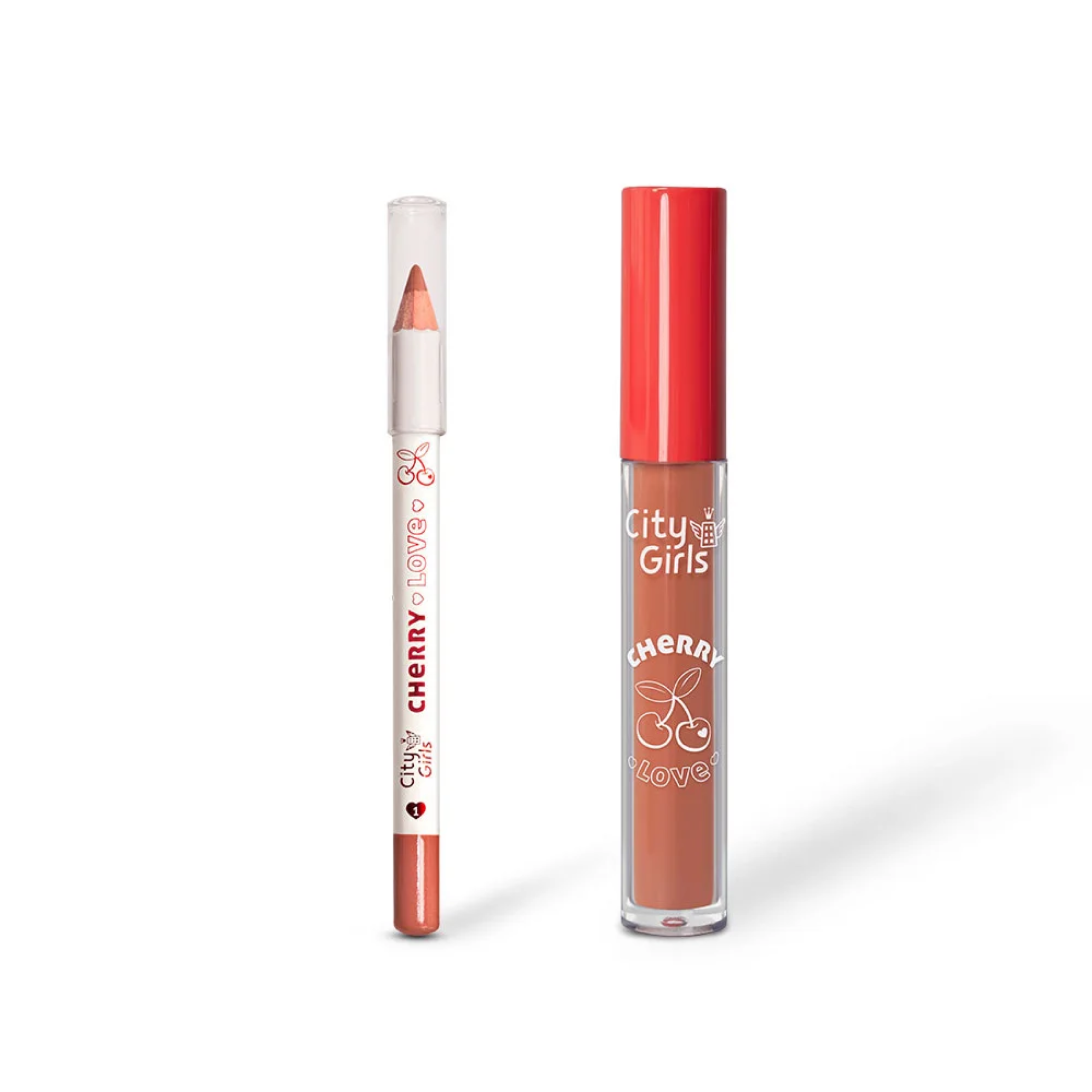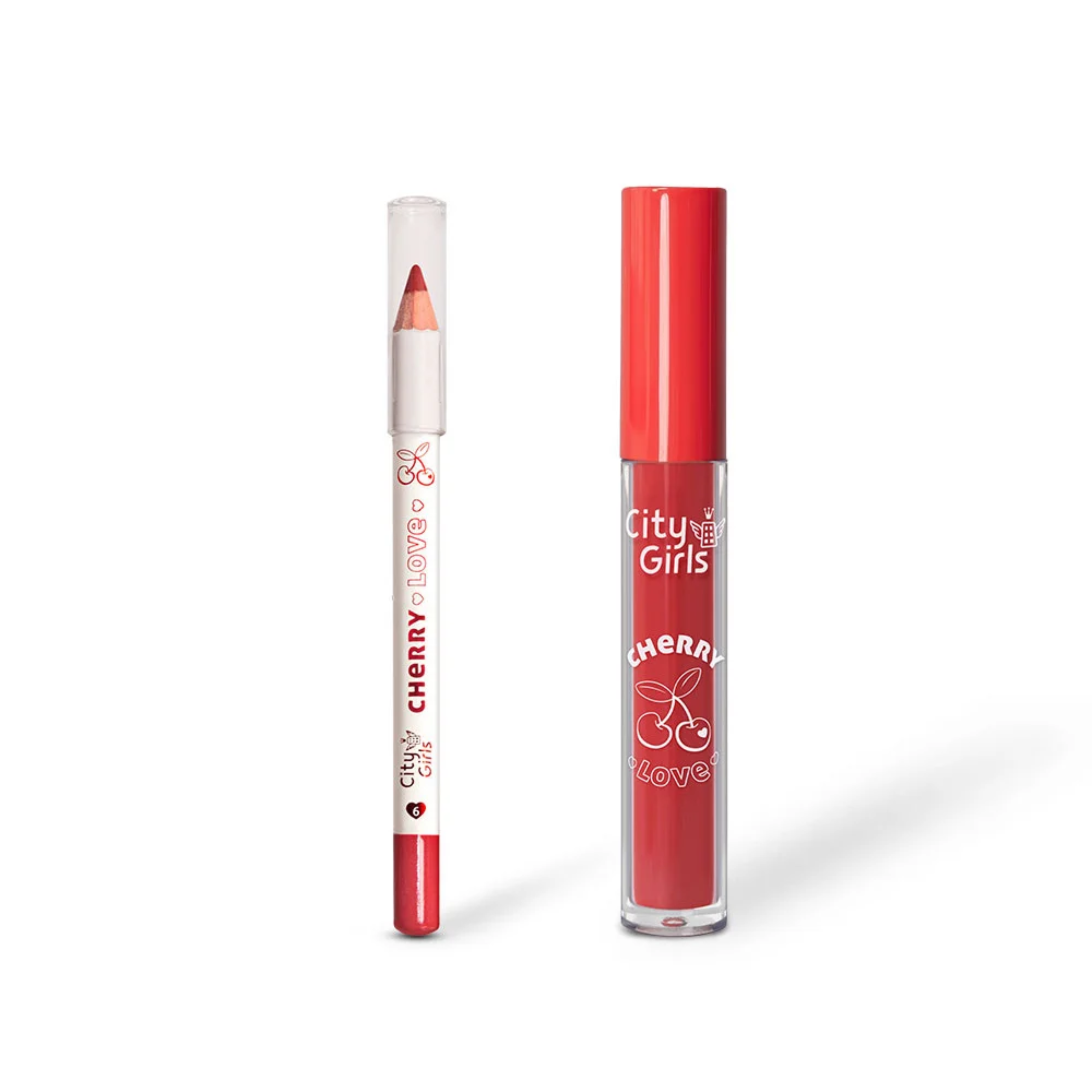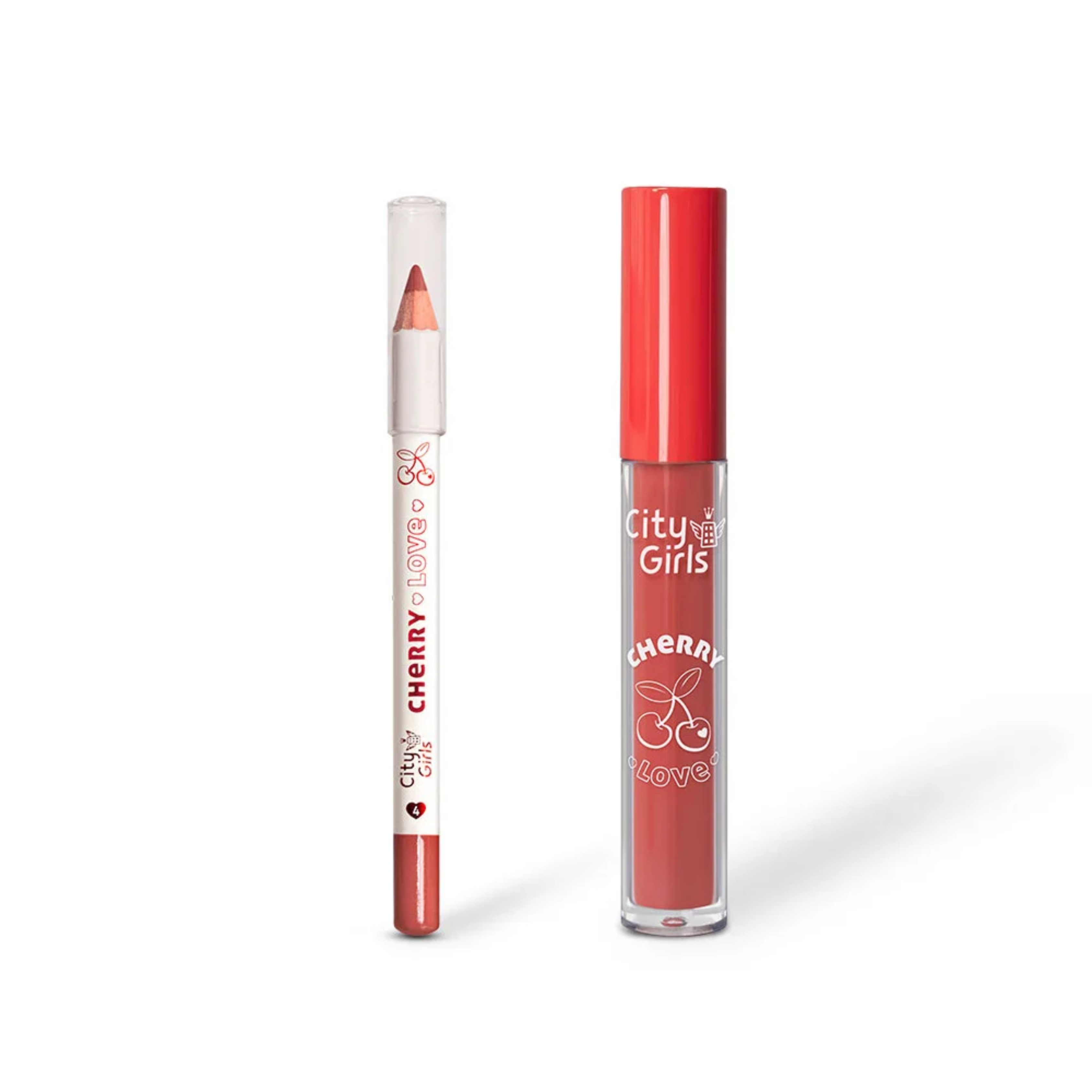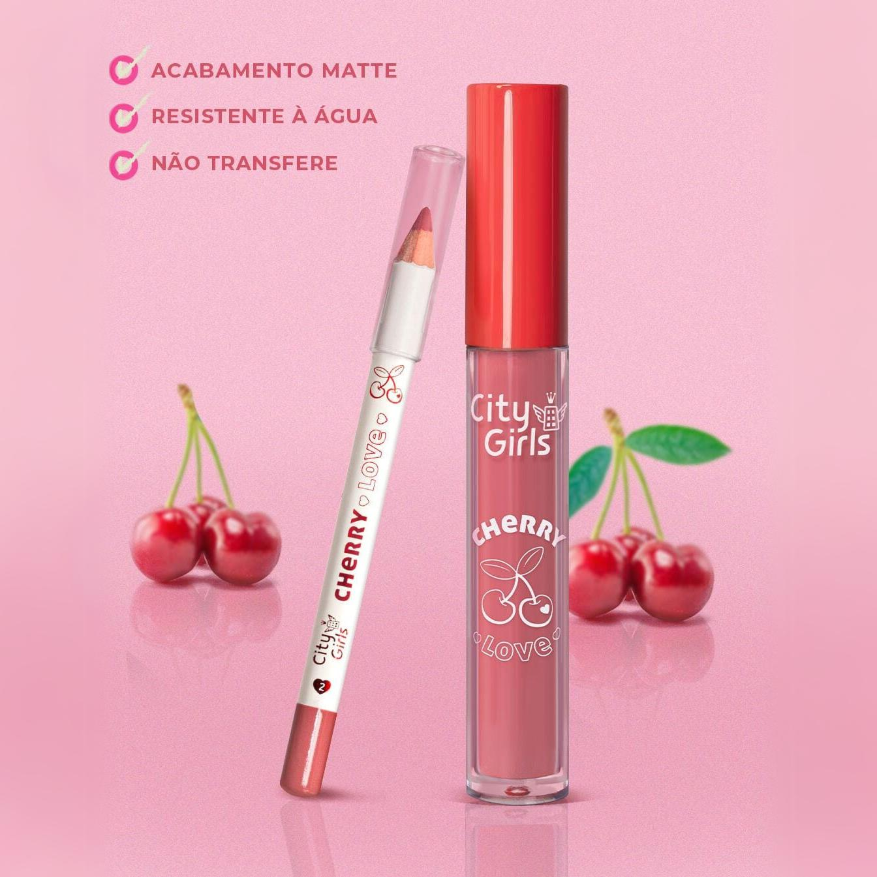 O kit labiaL Cherry Love City Girls! É um kit completo que vem com lápis labial para fazer o contorno dos lábios e um batom líquido matte para preencher e finalizar os lábios.