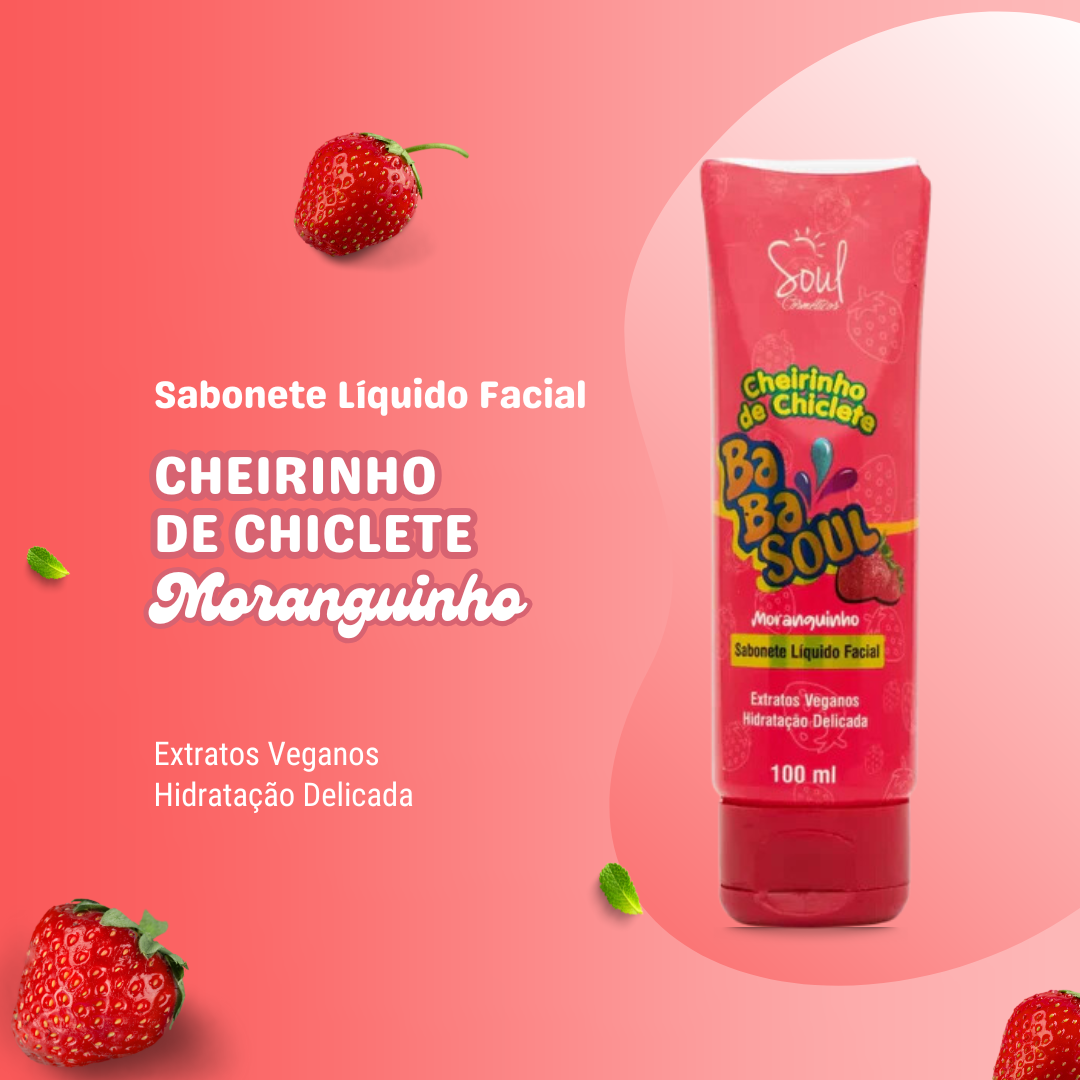 Transforme sua rotina de cuidados com o Sabonete Líquido Facial Cheirinho de Chiclete Moranguinho Babasoul, uma maneira irreverente e leve de limpar e revitalizar sua pele. Com um irresistível aroma de chiclete Babalu, este sabonete oferece uma experiência sensorial única, enquanto cuida delicadamente do seu rosto.